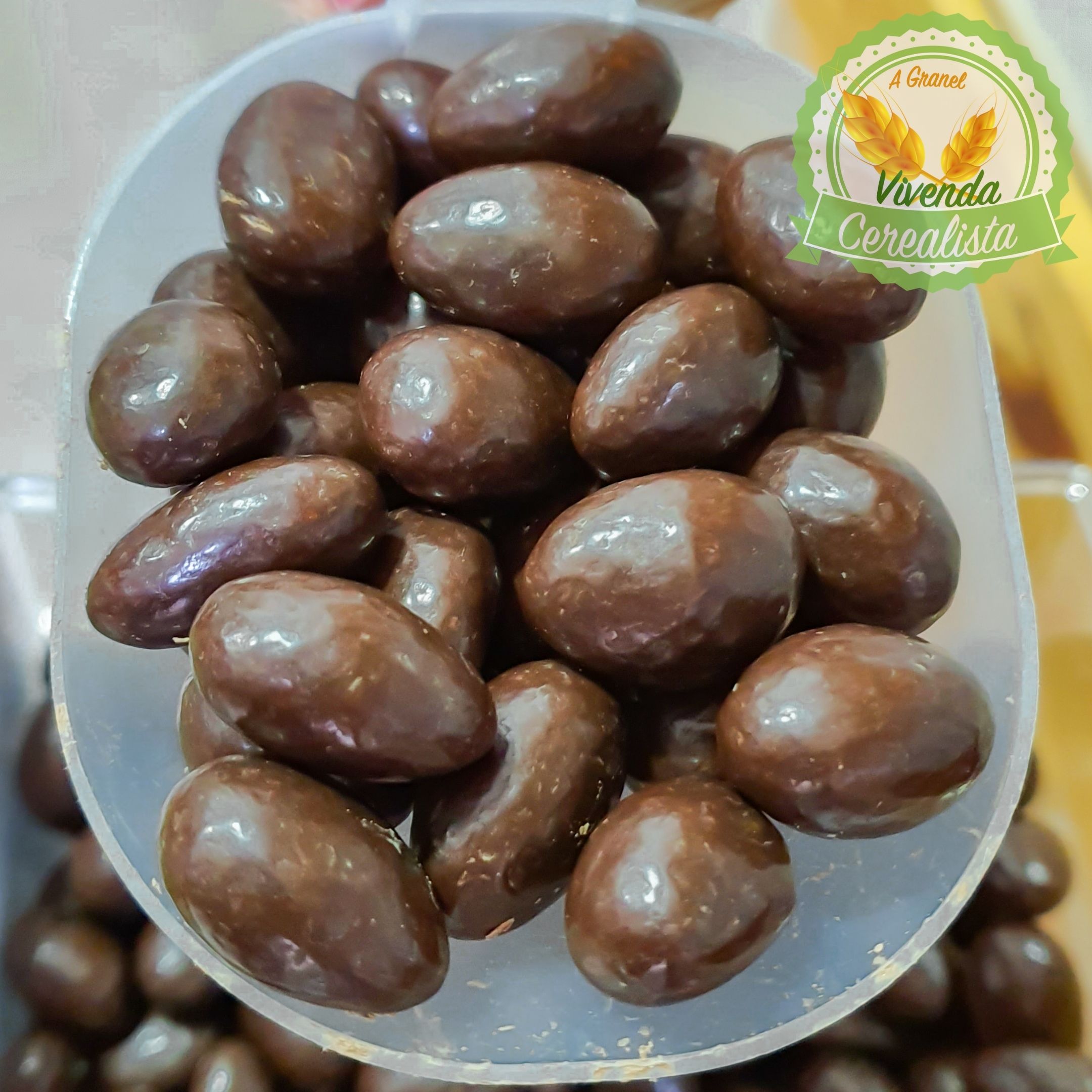 Drágea de amêndoa coberto com chocolate meio amargo.